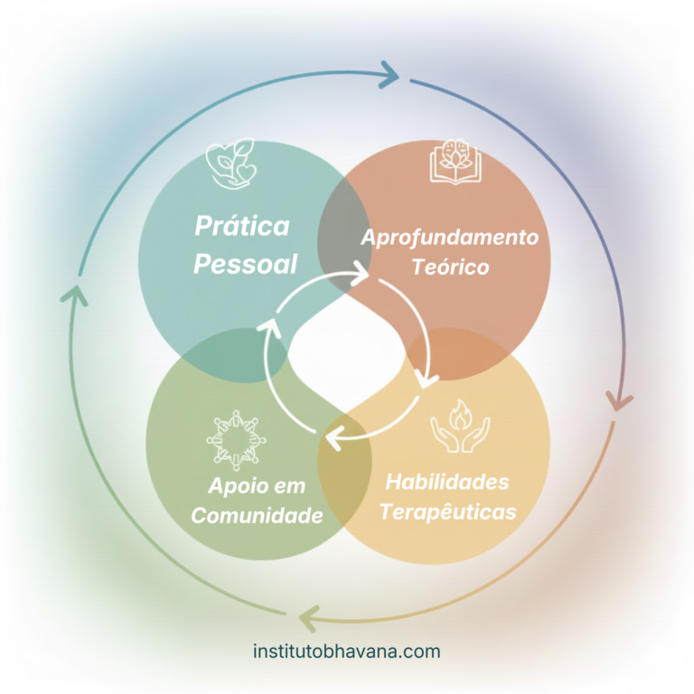 Um percurso vivo e contínuo, que tem como pilares estudo aprofundado, prática pessoal, desenvolvimento de habilidades terapêuticas e comunidade de cuidado.